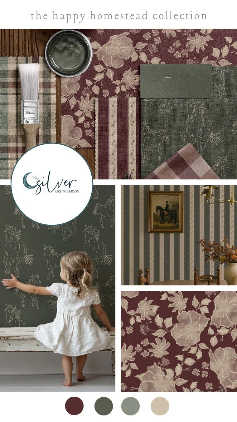 I’m Jody Pittner, Owner and Chief Creative of Silver Like the Moon, and I love creating patterns and products that feel as good as they look. I want someone to hold one of my creations or walk into a space with my wallpaper and feel something. With my background as an artist and art therapist, I have a deep understanding about the psychology of color and relationship we humans have to our environments. Whether I’m designing a surface pattern collection for a beautiful custom wallpaper, an art piece, or one of my curated mood boards, I pour all of my creativity and energy into my work.